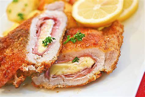 Cordon bleu ( varkenssneetje gevuld met hesp, kaas en gepanneerd)