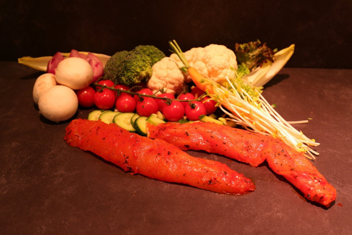 Gemarineerd kalkoenhaasje omring met gerookt spek van het huis -+ 250gr/st